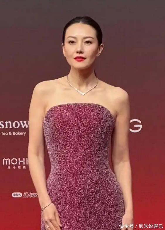 这款红色抹胸紧身礼服,没能突显出她的迷人身材,反倒露出了不少瑕疵。在活动中,高圆圆的背好像一直没有挺直,所以这件抹胸礼服总让我觉得快要滑下来似的。