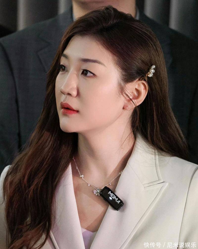 一头短发绑成马尾,利索地夹在后脑勺上,看着挺干净利落的。整体妆容挺大气的,再配上笔直的西装,感觉气场十足。